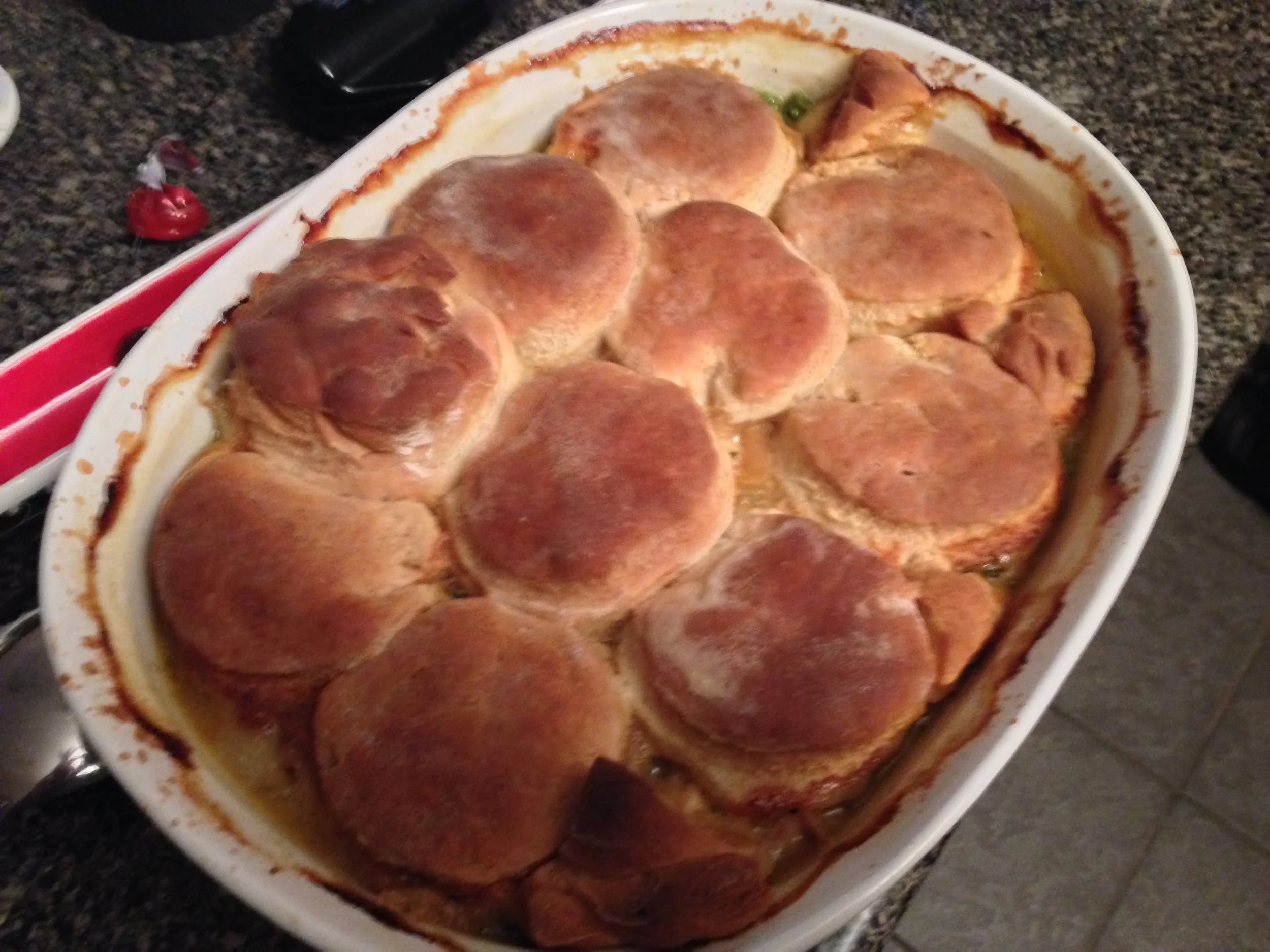 Place the biscuit rounds atop the poultry and vegetable stew. Dot the biscuits with soft butter and put the pot, uncovered into the preheated oven. Bake until the biscuits have risen and are golden brown and crisp on top and the stew bubbles beneath. (About 25 minutes)